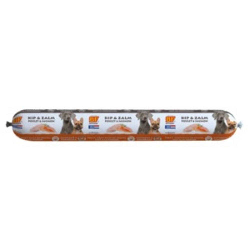 BF Petfood Vleesvoeding Hondenvoer Met ZalmBF Petfood vleesvoeding is een natuurlijke, complete en houdbare hondenvoeding op basis van verse zalm, kip, orgaanvlees, rijst, schapenvet en natuurkruiden. Is uitermate geschikt voor vleesdagen, als traktatie, voor onderweg, smaakmaker, bij omschakeling naar ander voer of voor honden die slecht reageren op droogvoeding. Handige 800g worst. Geschikt voor iedere hond, van pup tot senior.natuurlijke, complete houdbare hondenvoedingop basis van verse zalm