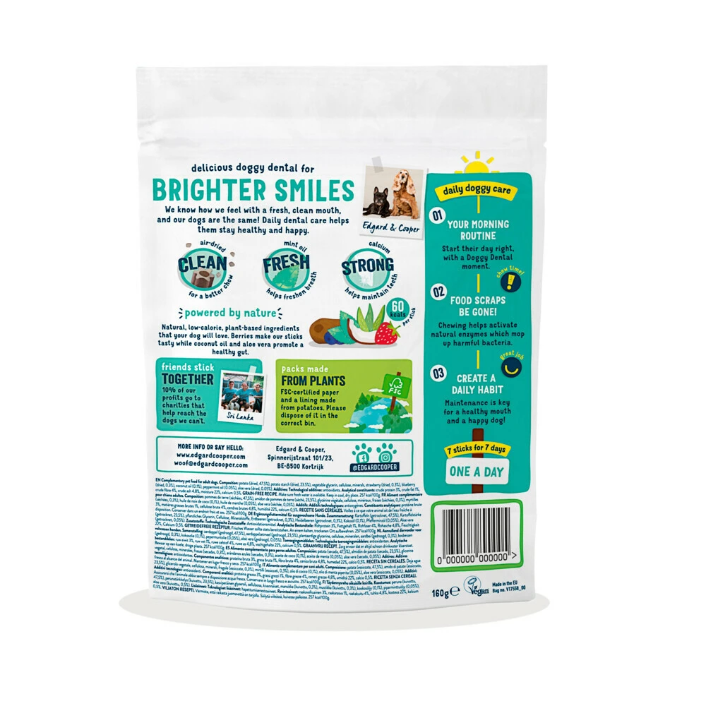 Edgard & Cooper Doggy Dental Sticks Aardbei & Frisse MuntolieDe Dental Sticks van Edgard & Cooper helpen jouw hond aan een schoon gebit, frisse adem én sterke tanden! De sticks zijn luchtgedroogd waardoor je hond er véél langer op kauwt voor meer effect en fun. Gemaakt van gezonde plantaardige ingrediënten die van nature caloriearm zijn, zoals aardbei en adem verfrissende muntolie.Geef je hond één stick per dag voor een effectieve poetsroutine,