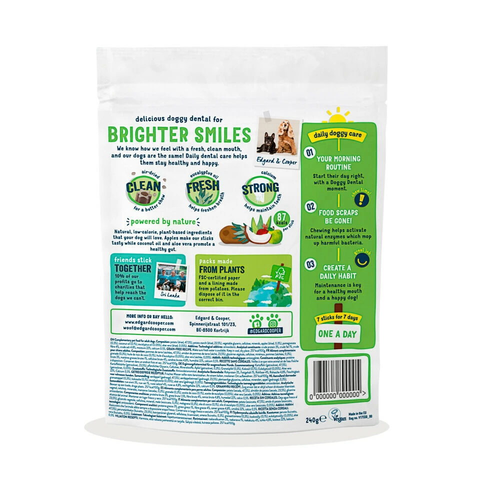 Edgard & Cooper Doggy Dental Sticks Appel & EucalyptusolieDe Dental Sticks van Edgard & Cooper helpen jouw hond aan een schoon gebit, frisse adem én sterke tanden! De sticks zijn luchtgedroogd waardoor je hond er véél langer op kauwt voor meer effect en fun. Gemaakt van gezonde plantaardige ingrediënten die van nature caloriearm zijn, zoals knapperige appel en adem verfrissende eucalyptusolie.Geef je hond één stick per dag voor een effectieve p