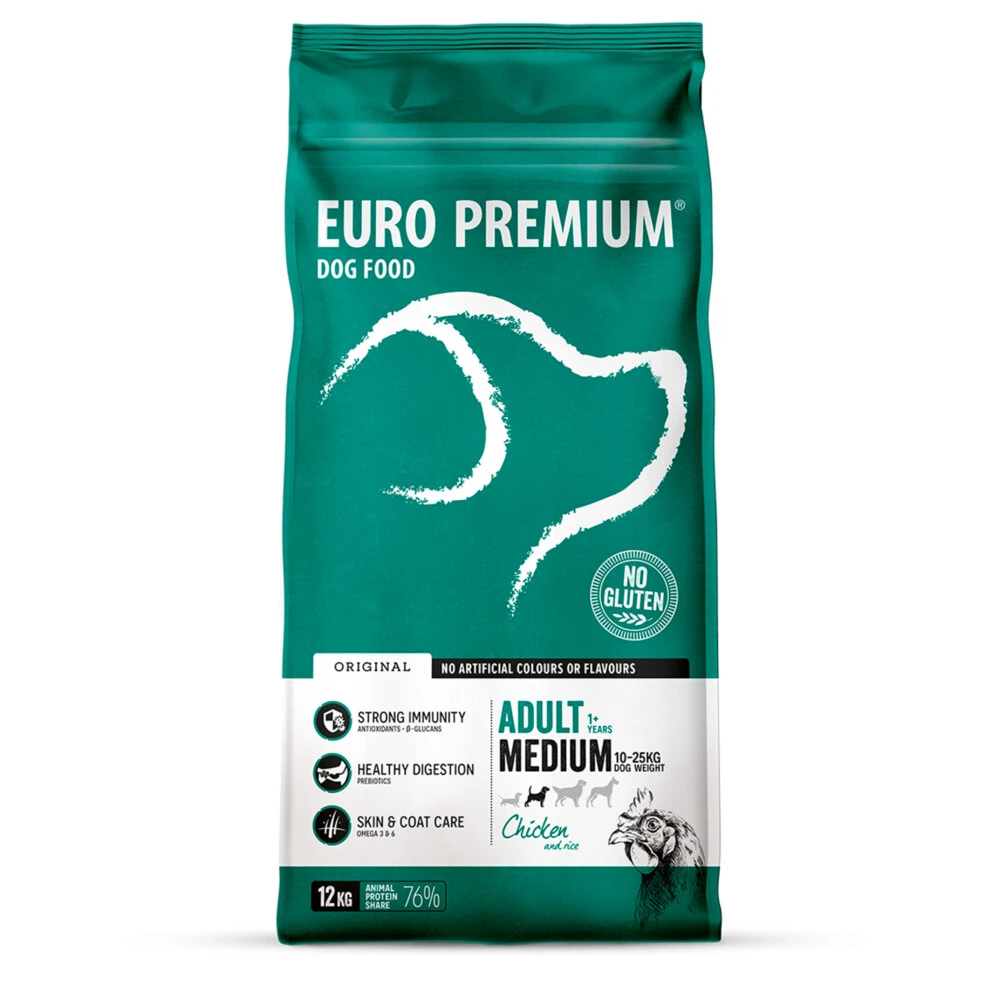 Euro-Premium Adult Medium Kip – RijstEuro-Premium Adult Medium – Chicken & Rice is een volledige, super-premium voeding voor volwassen honden van middelgrote rassen (vanaf 1 jaar en 10 – 25kg volwassen gewicht).Een optimale weerstand en een gezonde spijsvertering worden ondersteund door de toevoeging van een unieke blend van plantenextracten – rijk aan antioxidanten – aangevuld met prebiotica en β-glucanen. Een optimale verhouding Omega-3 / Omega-6 vetzuren bevordert een gezonde huid en