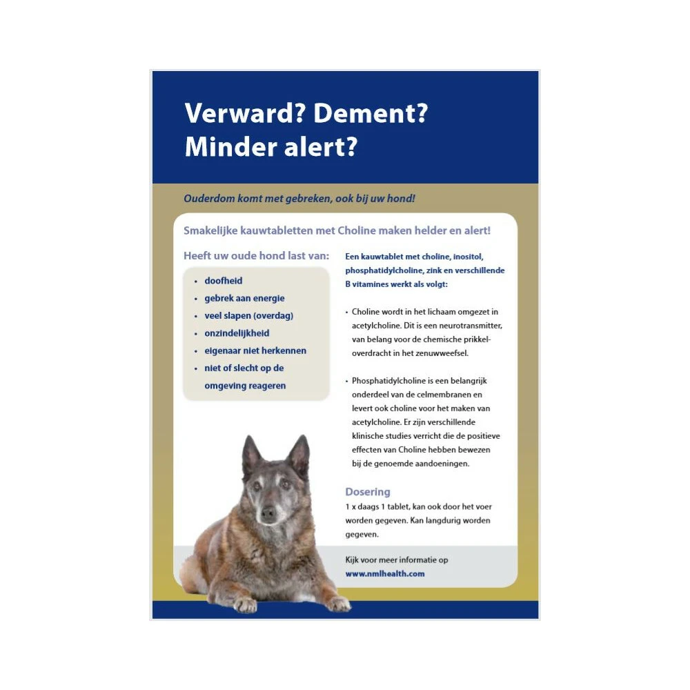 Cholodin Voor de ouder wordende hondCholodin hond is een voedingssupplement voor de hond met de werkzame stof choline. Cholodin is speciaal ontwikkeld voor de ouder wordende hond met cognitiegerelateerde problemen zoals;- Het niet herkennen van het baasje – Onzindelijkheid – Doofheid – Minder alert zijn